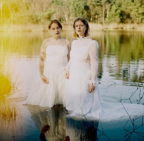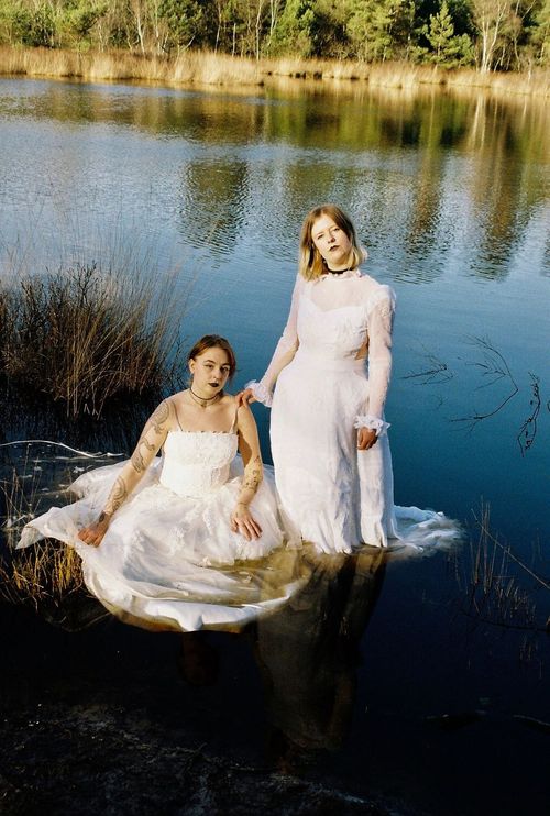 Kim: “We wilden eigenlijk voor onze persfoto’s het schilderij van Ophelia nabootsen. Daarvoor hadden we twee tweedehands trouwjurken op de kop getikt, alleen was het veel te koud die dag. Maar we vonden het eigenlijk wel vet. Vroeger had je ook Evanescence, ik vond het altijd heel gaaf hoe zij in die supervette jurken stond.”